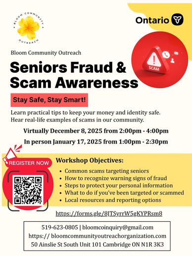 Bloom Community Outreach invites you to a series of free, engaging, and educational sessions designed to support seniors in living healthy, empowered, and financially confident lives.